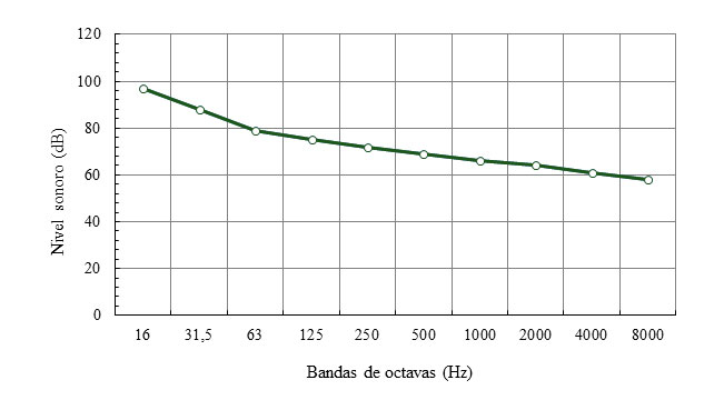 El objetivo acústico fue que en el interior de la cabina no debían registrarse niveles sonoros que superaran los del perfil NCB = 65[1] al que corresponde aproximadamente un nivel de 75 dBA. En la Figura 2 se muestra la curva de este perfil, tomado de la publicación citada. Los niveles de las tres primeras bandas de octavas (centradas en 16, 31,5 y 63 Hz) pueden inducir a vibraciones mecánicas en estructuras livianas, tales como superficies ejecutadas con tableros Durlock o similares.