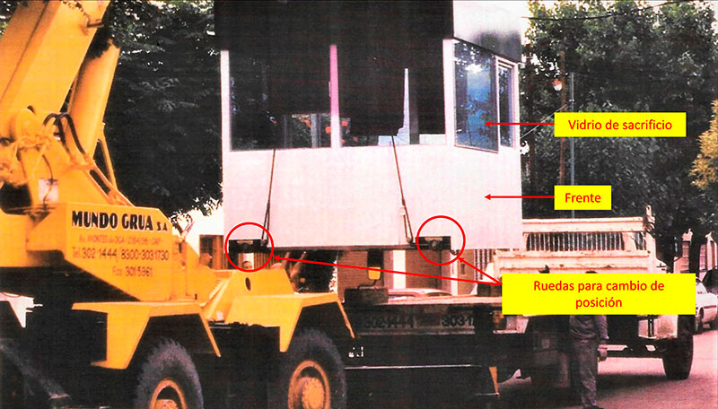 Figura 3. Cabina saliendo del taller para su destino. Se señalan algunas características