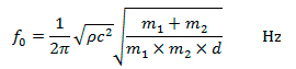 Para el primer caso se diseñaron ventanas de doble vidriado que para su diseño se tuvo en cuenta espesor de los paños y su separación. Esta separación d debe ser la adecuada para que la frecuencia f0 en torno de la que se produce una disminución notable, conocida como resonancia “masa-resorte-masa”, originada por el acople entre paños por el aire encerrado entre ellos, debe ubicarse en el rango de bajas frecuencias que no afecten al proyecto. Para su cálculo se empleó la expresión siguiente[3] en la que m1 y m2 (kg/m2) son las densidades superficiales de cada uno de los dos paños de vidrio y d (m) la separación entre ellos.